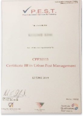 - Certificate III in Urban Pest Management (NRT) #190033